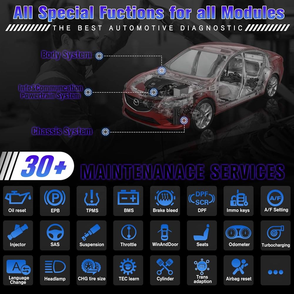 All special functions, EPB, DPF, SAS, Oil reset, BMS, TPMS sensor ID relearn, etc.
